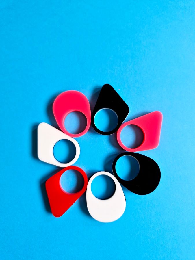 Mirror perspex rings inspired by Joan Miro's painting 'The Birth of Day'. Stackable rings in black and white, red and neon pink, in oval and slanted square shape. Mix and match or wear as a pair.