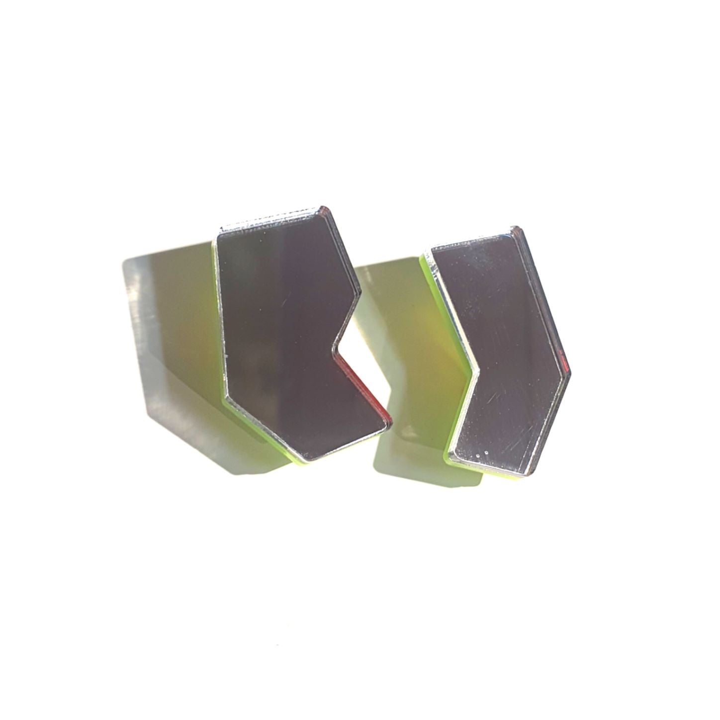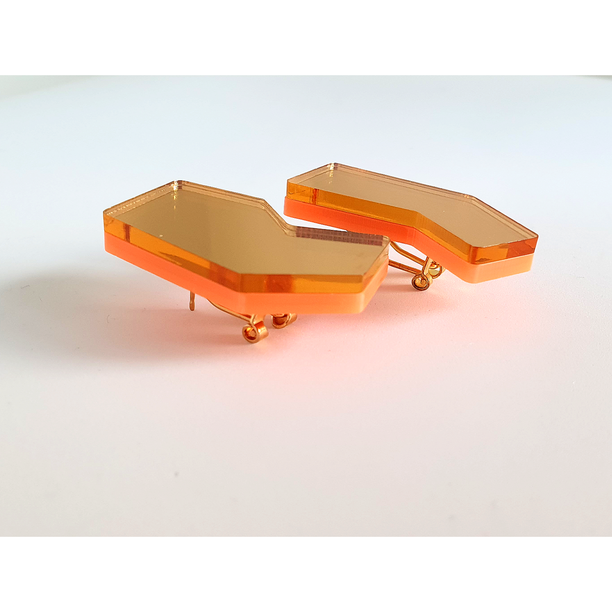 eve ray designs gold mismatch earrings. eve ray geometric shaped earrings, made with mirrored perspex, come in two colour options - gold + mint and gold + neon orange.
