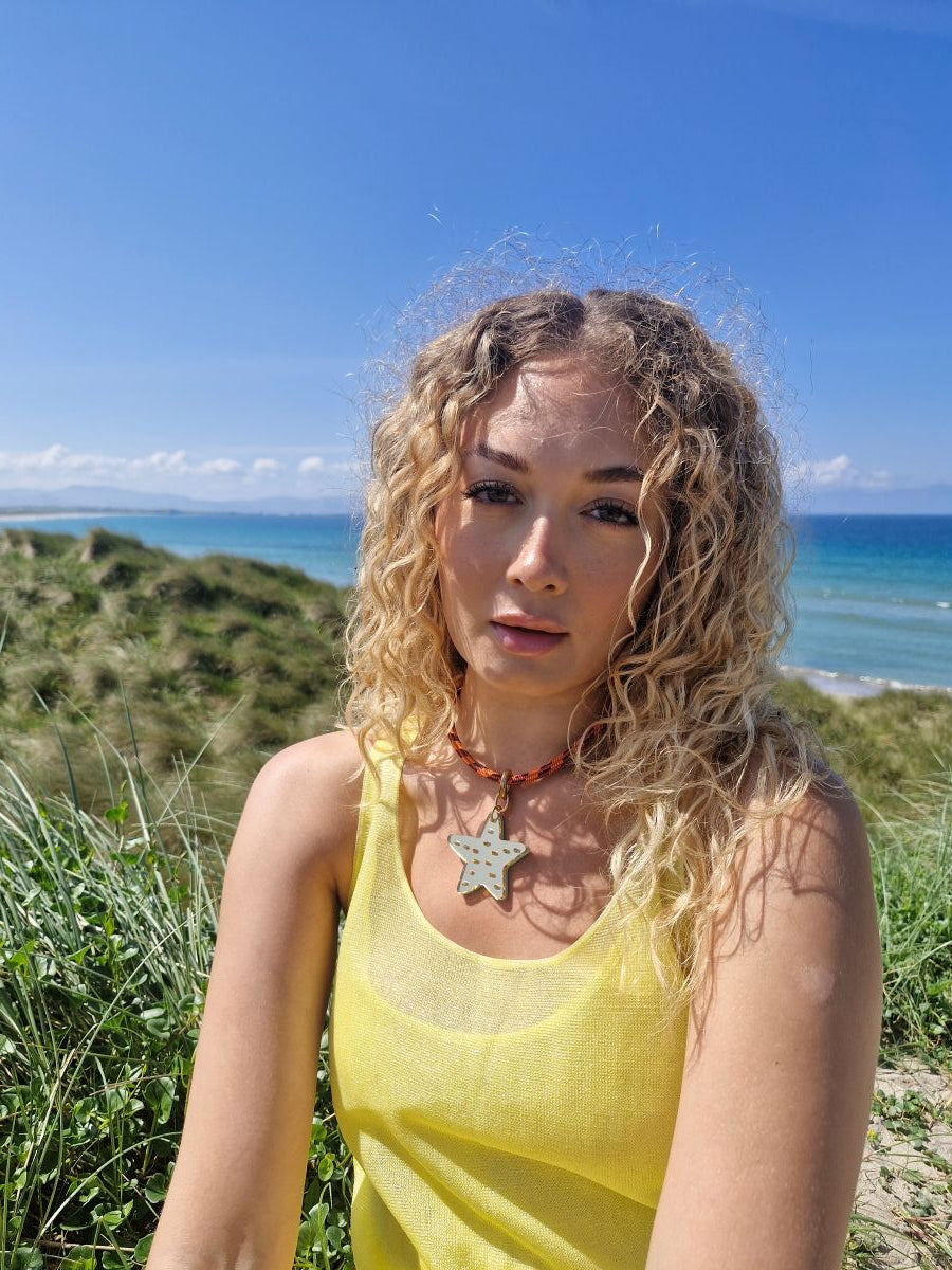 Introducing the starfish pendant by eve ray designs. The second drop in the new collection, 'Schiaparelli & The Sea'. The starfish is made with mirror gold and mirror silver perspex, with a multicolour rope necklace.
