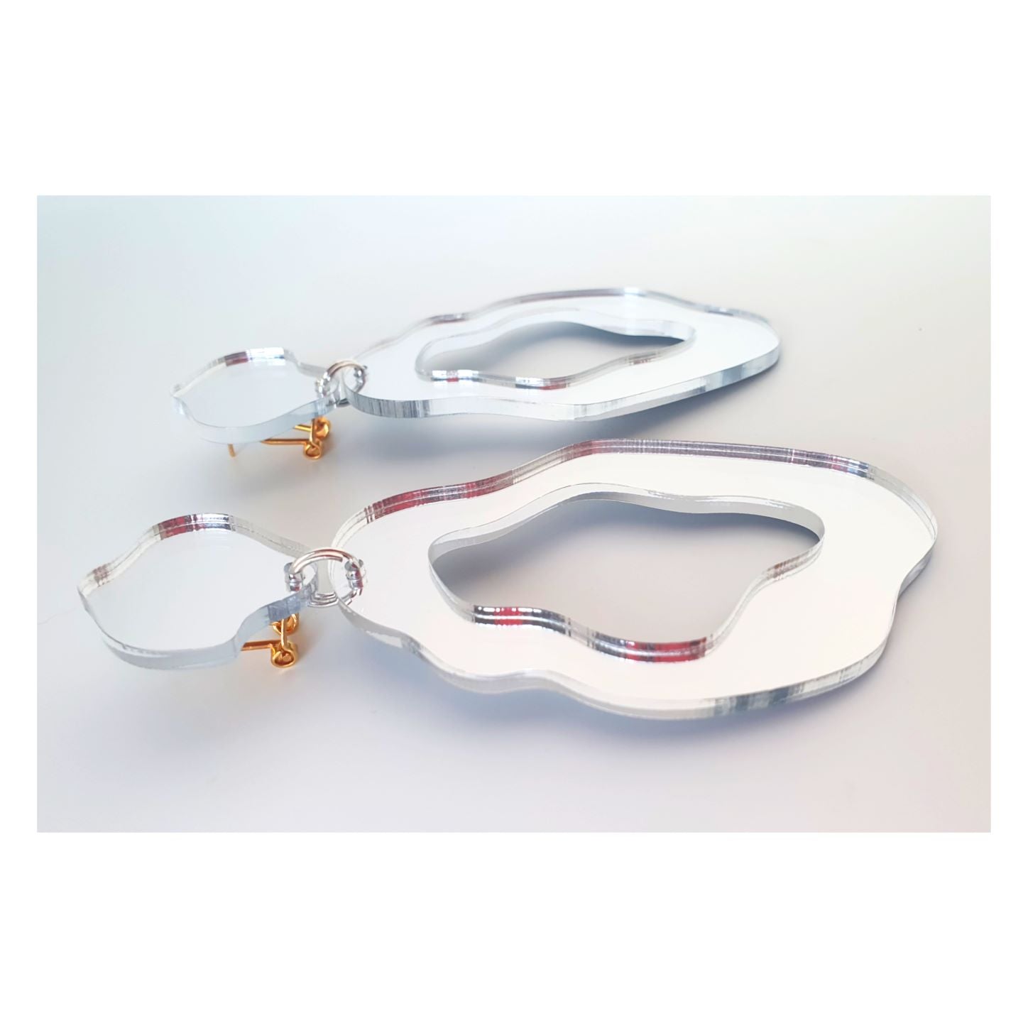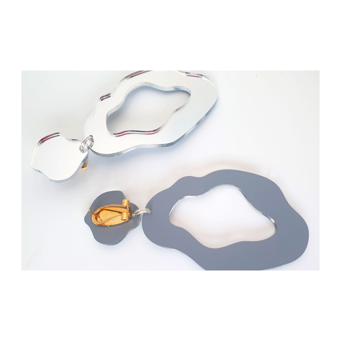 eve ray 'the garden 1925' mirror perspex drop earrings in silver. Inspired by Joan Miro's painting The Garden 1925. Maeve Barry designs fun, unique costume jewellery that puts a twist on traditional symbols and takes inspiration from art, Ireland and her childhood.